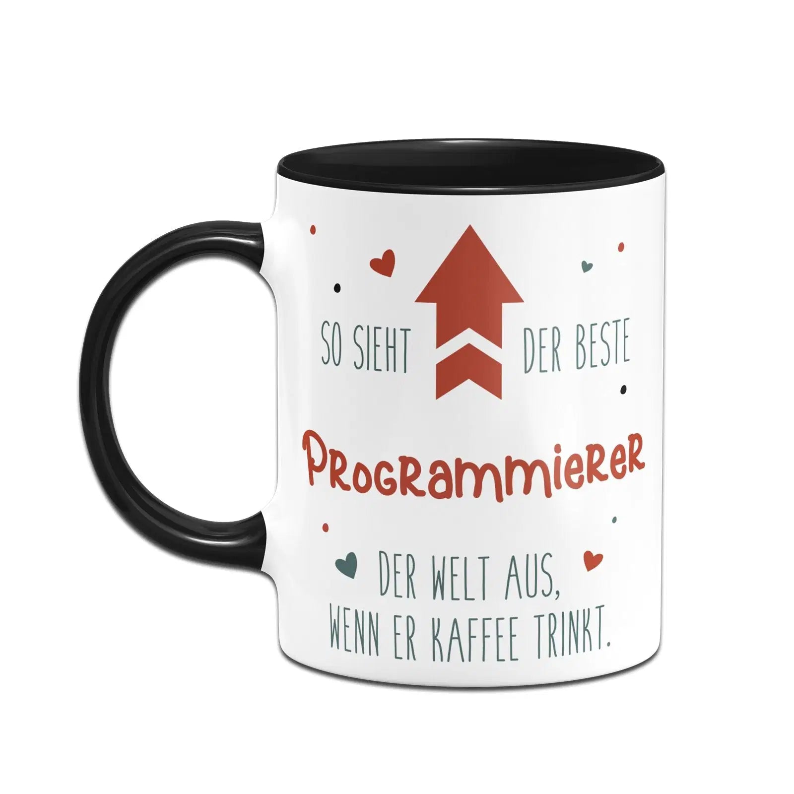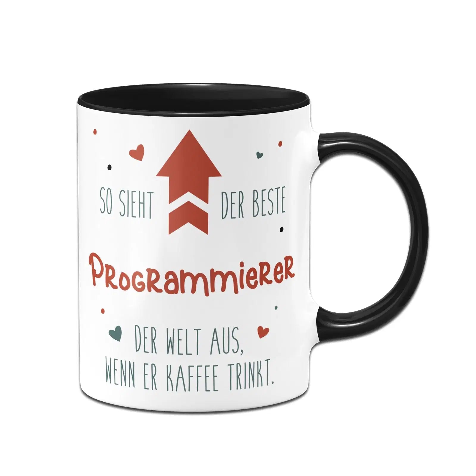 Tasse mit Spruch: So sieht der beste Programmierer der Welt aus ⬆️ wenn er Kaffee trinkt. ❤️