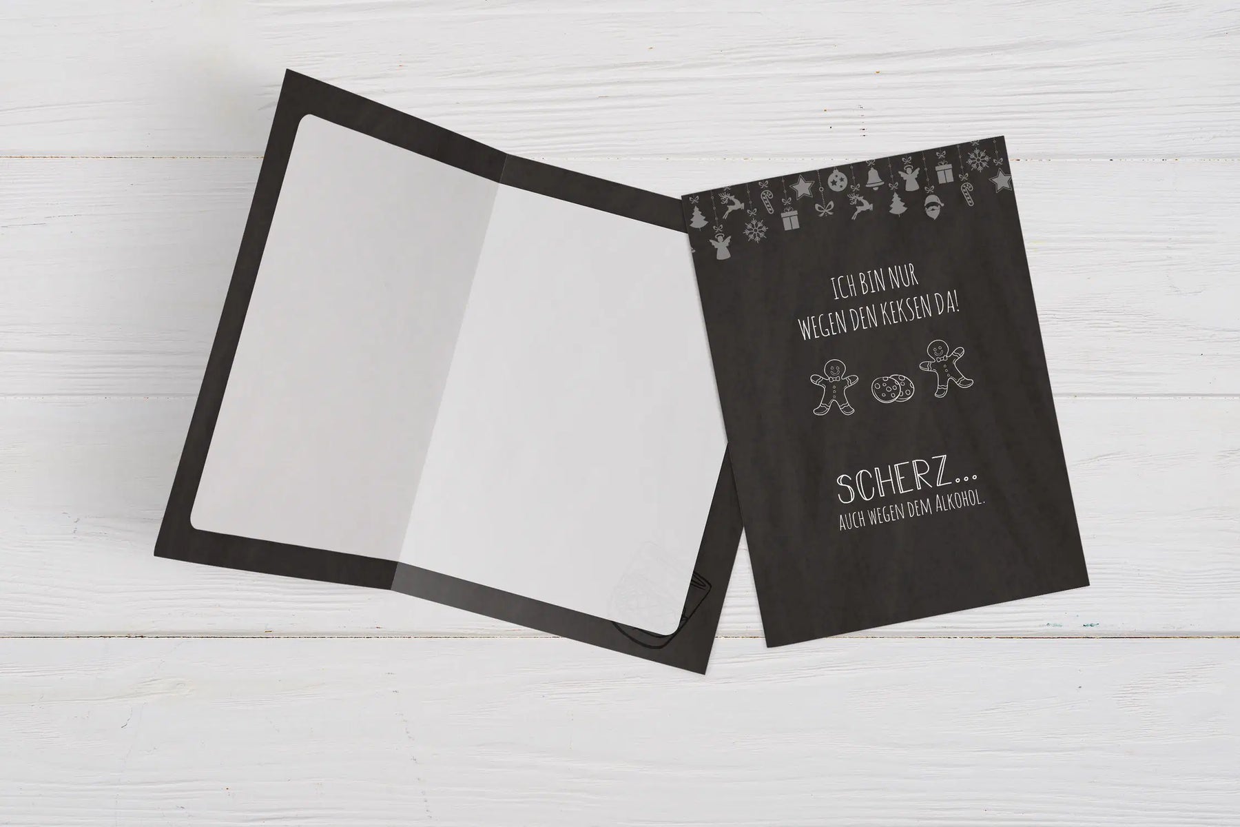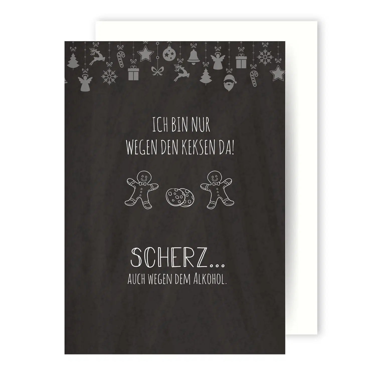 Grußkarte mit Spruch: Ich bin nur wegen den Keksen da! 🍪 Scherz... auch wegen dem Alkohol.