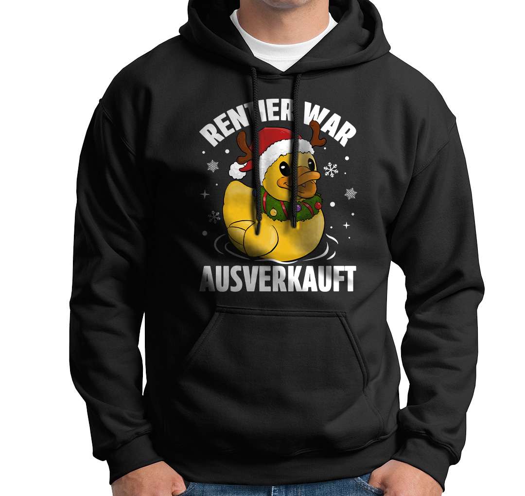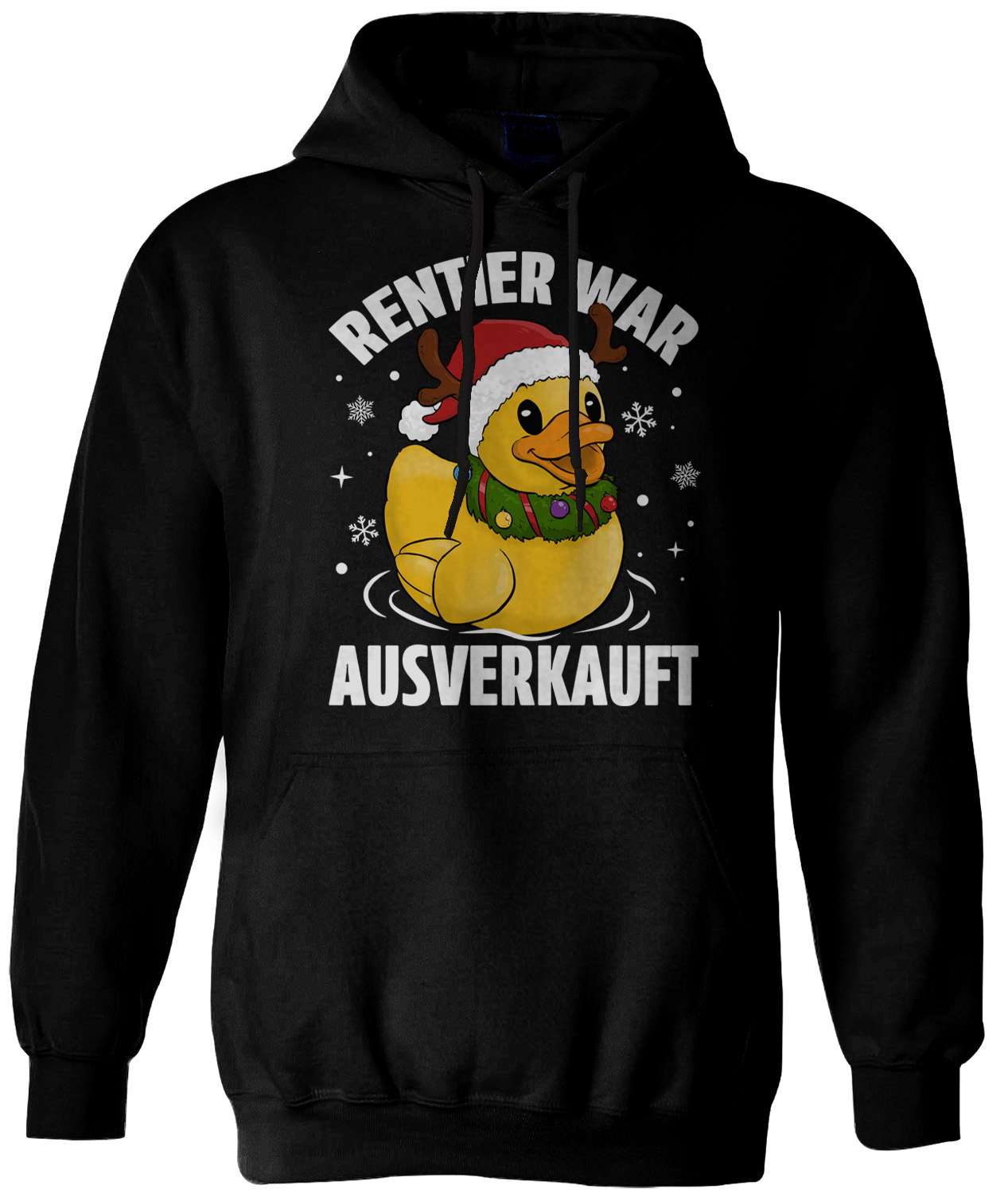 Hochwertiger Hoodie / Pullover mit weihnachtlichem Quietscheente-Motiv und Spruch: Rentier war ausverkauft 🦆⭐