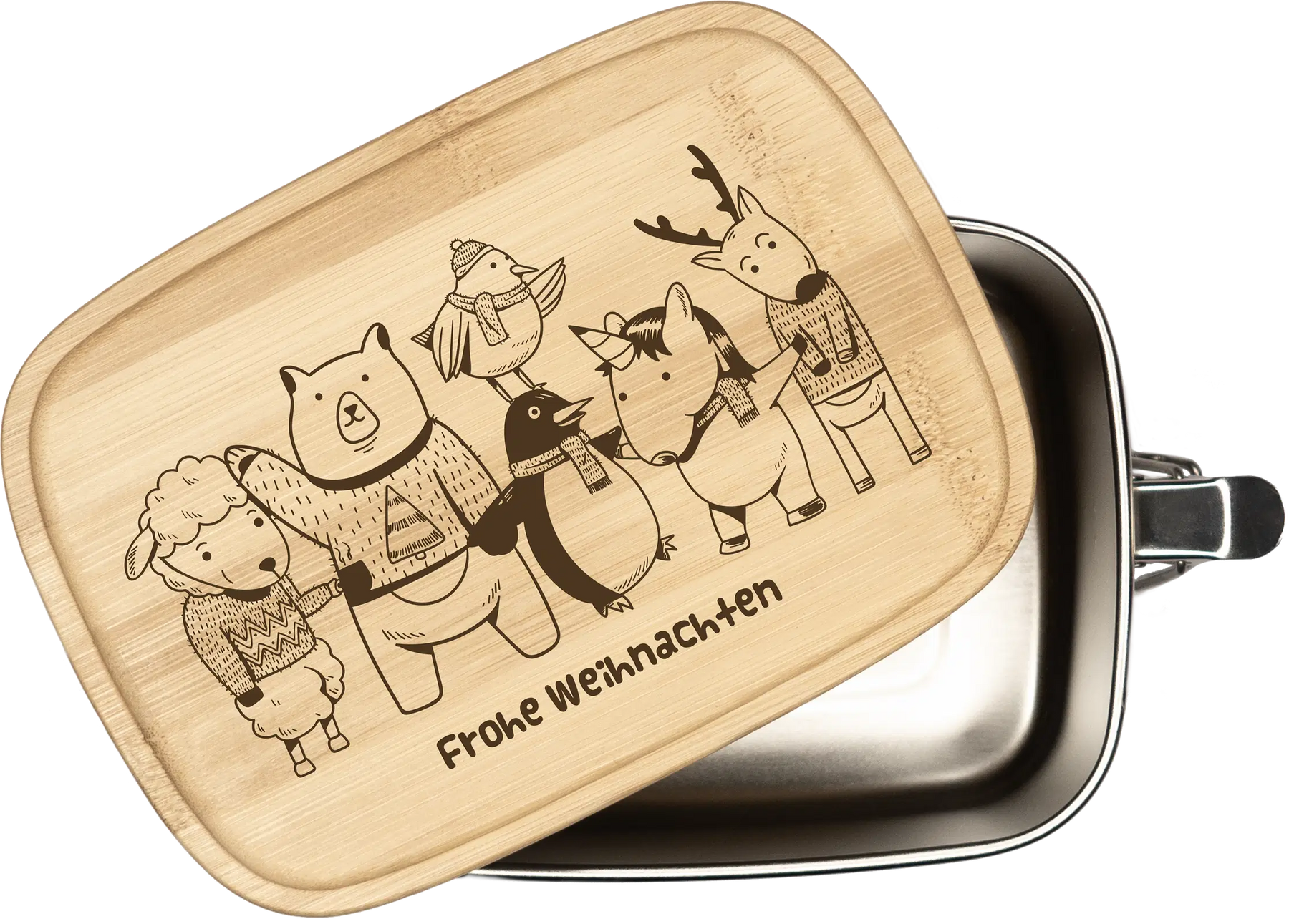 Grafik ist per Lasergravur graviert mit dem Spruch: Frohe Weihnachten mit Tieren 🐑🐻🦌