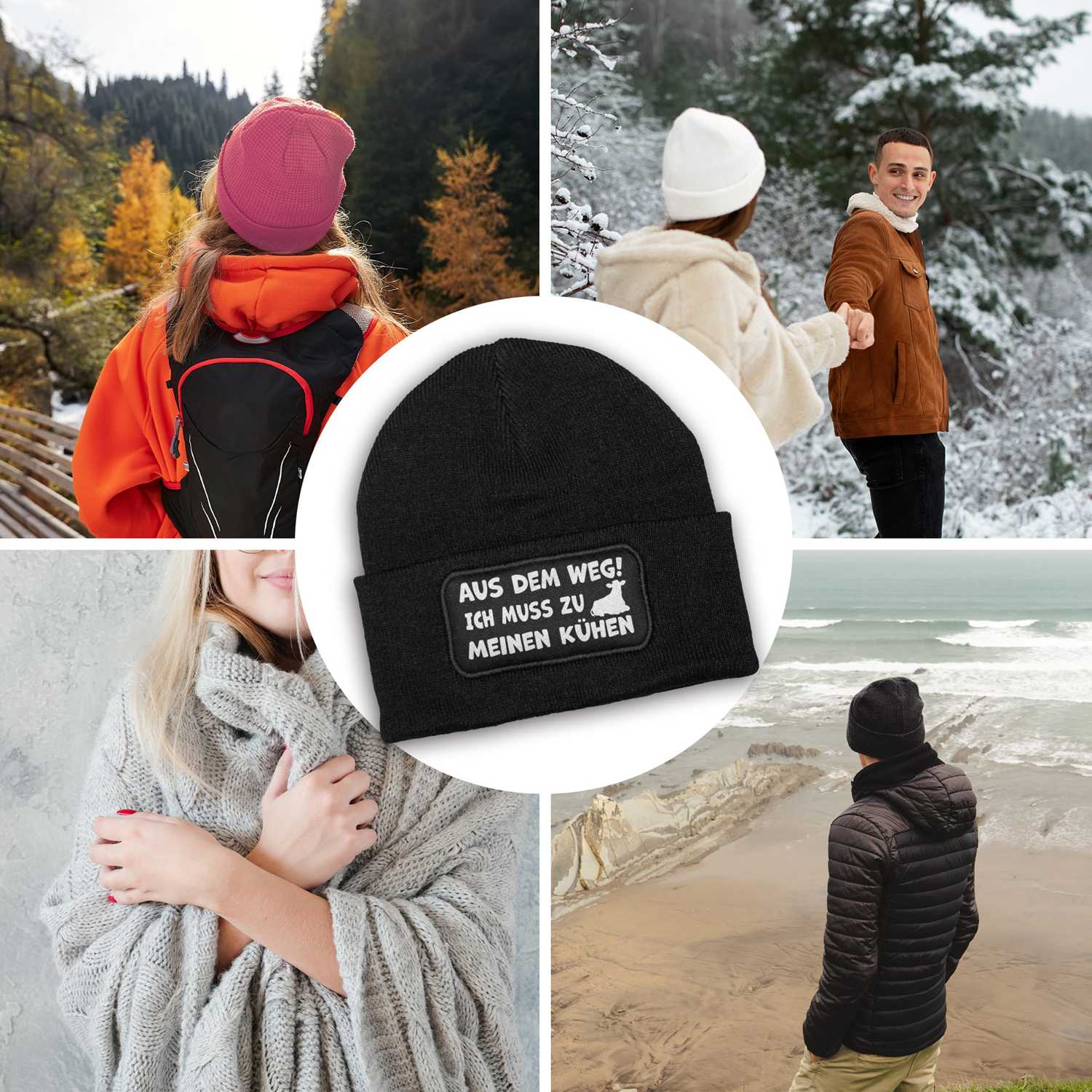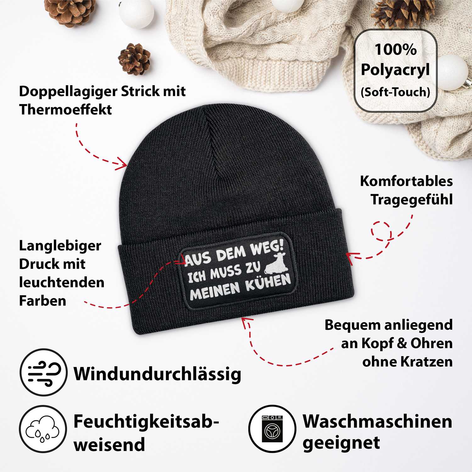 Wer morgens zuerst an seine Kühe denkt, hat den Stall im Herzen und mit dieser Mütze auch auf dem Kopf. „Aus dem Weg! Ich muss zu meinen Kühen“ bringt Deine Prioritäten auf den Punkt. Ob Du im Stall stehst, über die Weide läufst oder nur gedanklich bei Deinen Rindern bist – diese Beanie passt. Sie hält Dich schön warm und sorgt mit ihrem humorvollen Aufdruck garantiert für Gesprächsstoff. Ein perfektes Geschenk für Landwirt:innen, Kuhliebhaber:innen, Hofmenschen und alle, bei denen Muh vor Moin kommt.