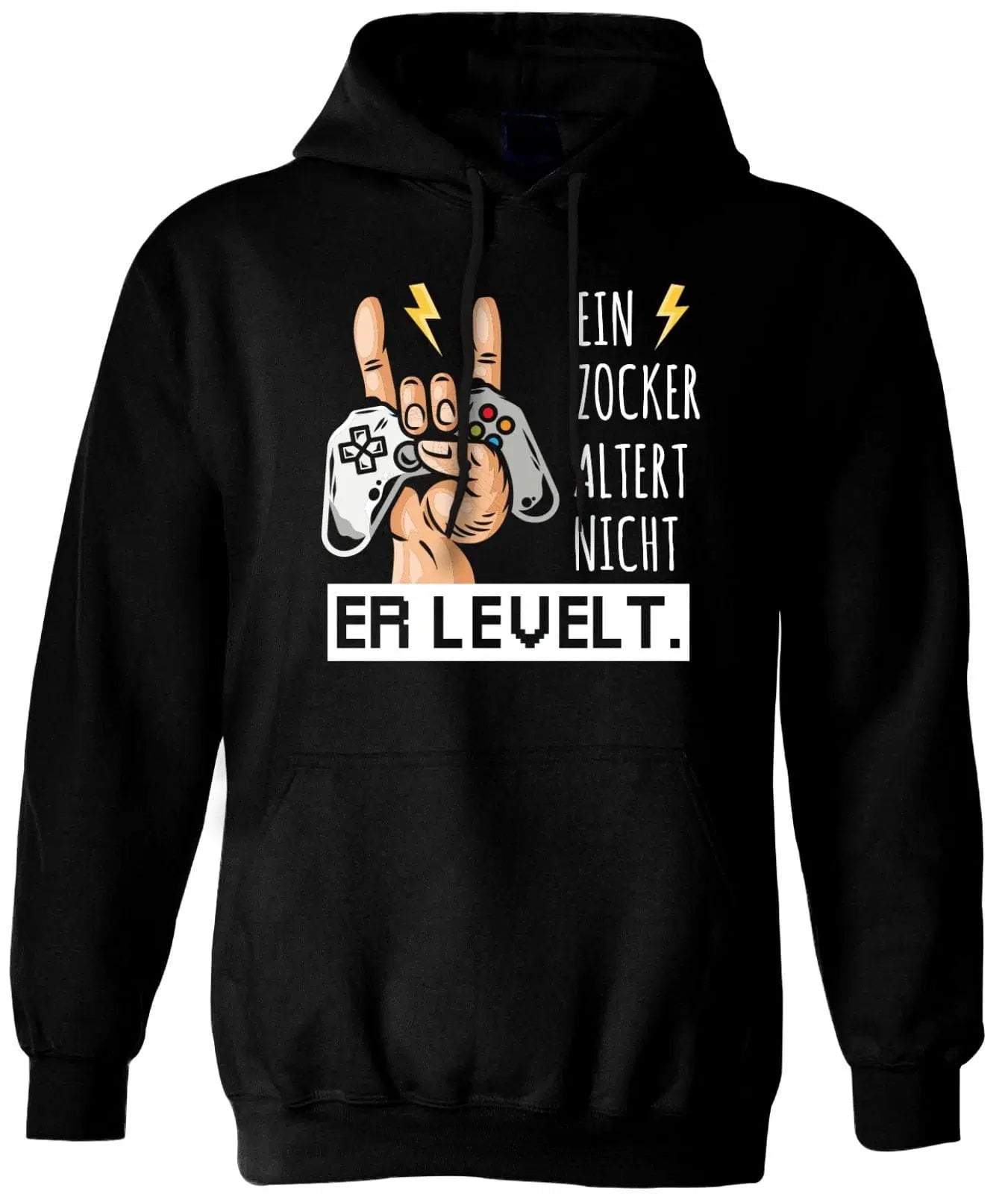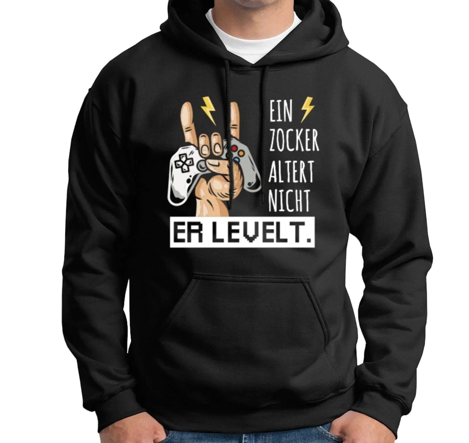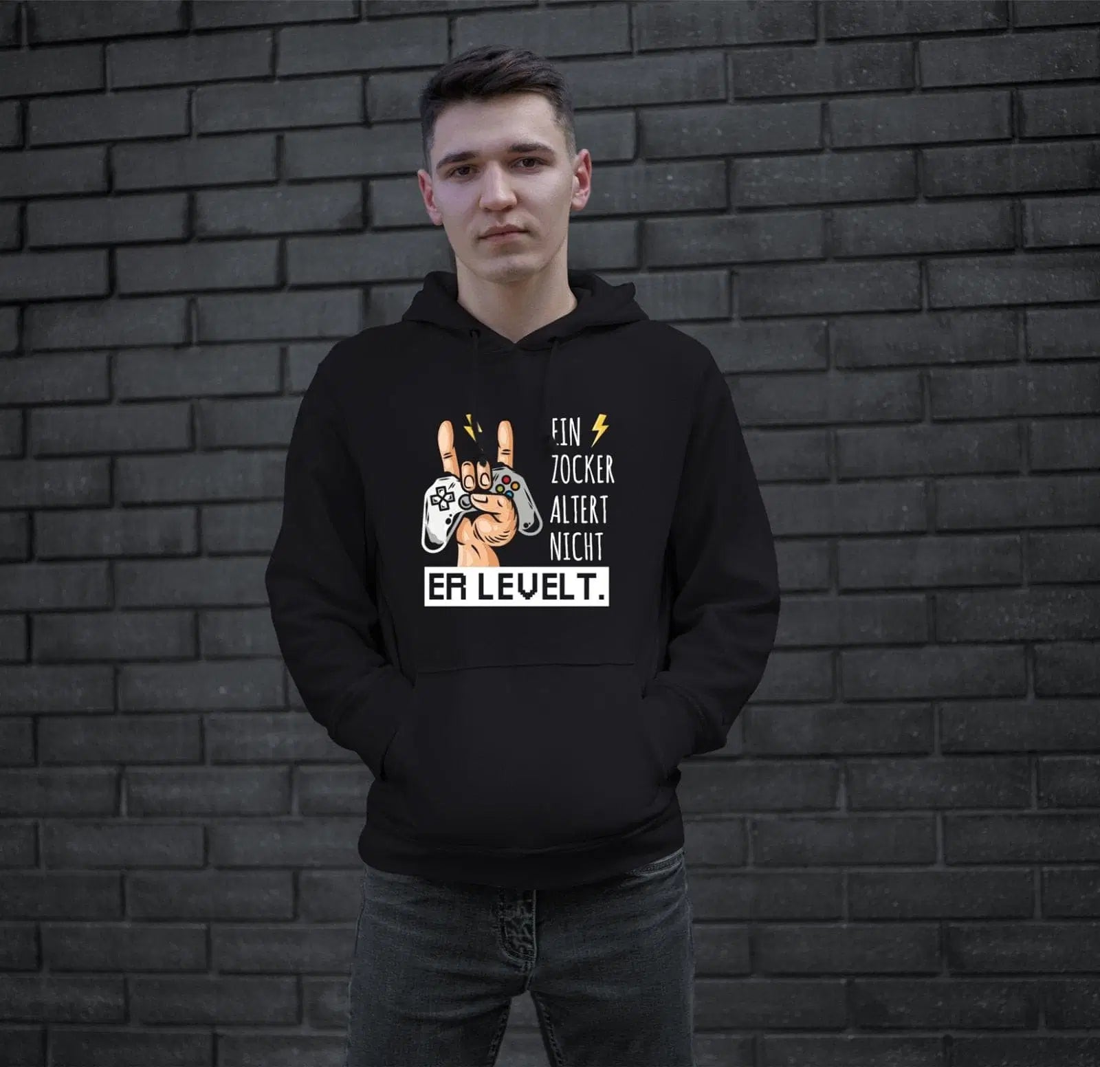 Hochwertiger Hoodie / Pullover mit Kapuze mit Motiv und Spruch: Ein Zocker altert nicht er levelt. 🎮🤘