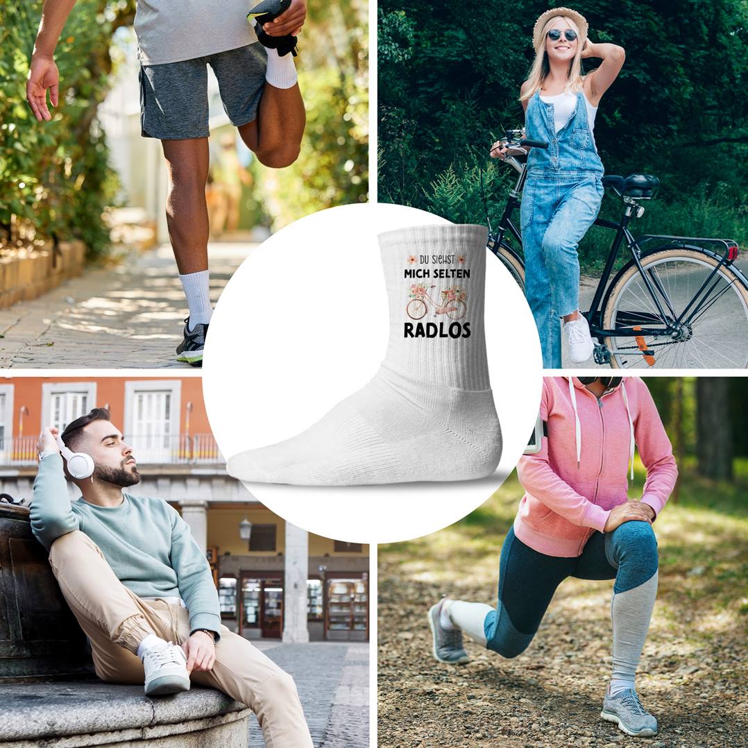 Diese fröhlichen Tennissocken bringen gute Laune in deinen Alltag – mit einem rosafarbenen Vintage-Fahrrad-Motiv, liebevoll verziert mit Blümchen und Gepäckträger. Der Spruch „Du siehst mich selten Radlos“ 🌸 macht die Socken zu einem echten Hingucker. Bequem, atmungsaktiv und robust: perfekt für Sport, Freizeit und natürlich jede Radtour.