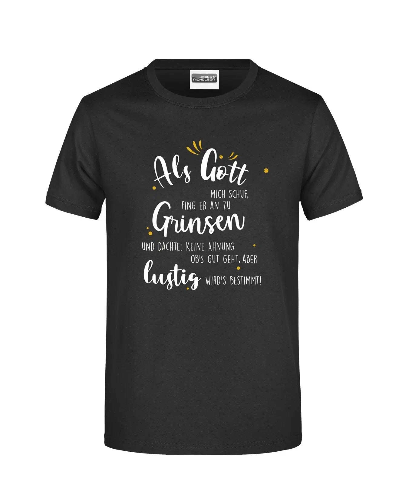 T-Shirt mit Spruch: Als Gott mich schuf, fing er an zu grinsen und dachte: Keine Ahnung ob´s gut geht, aber lustig wird´s bestimmt!