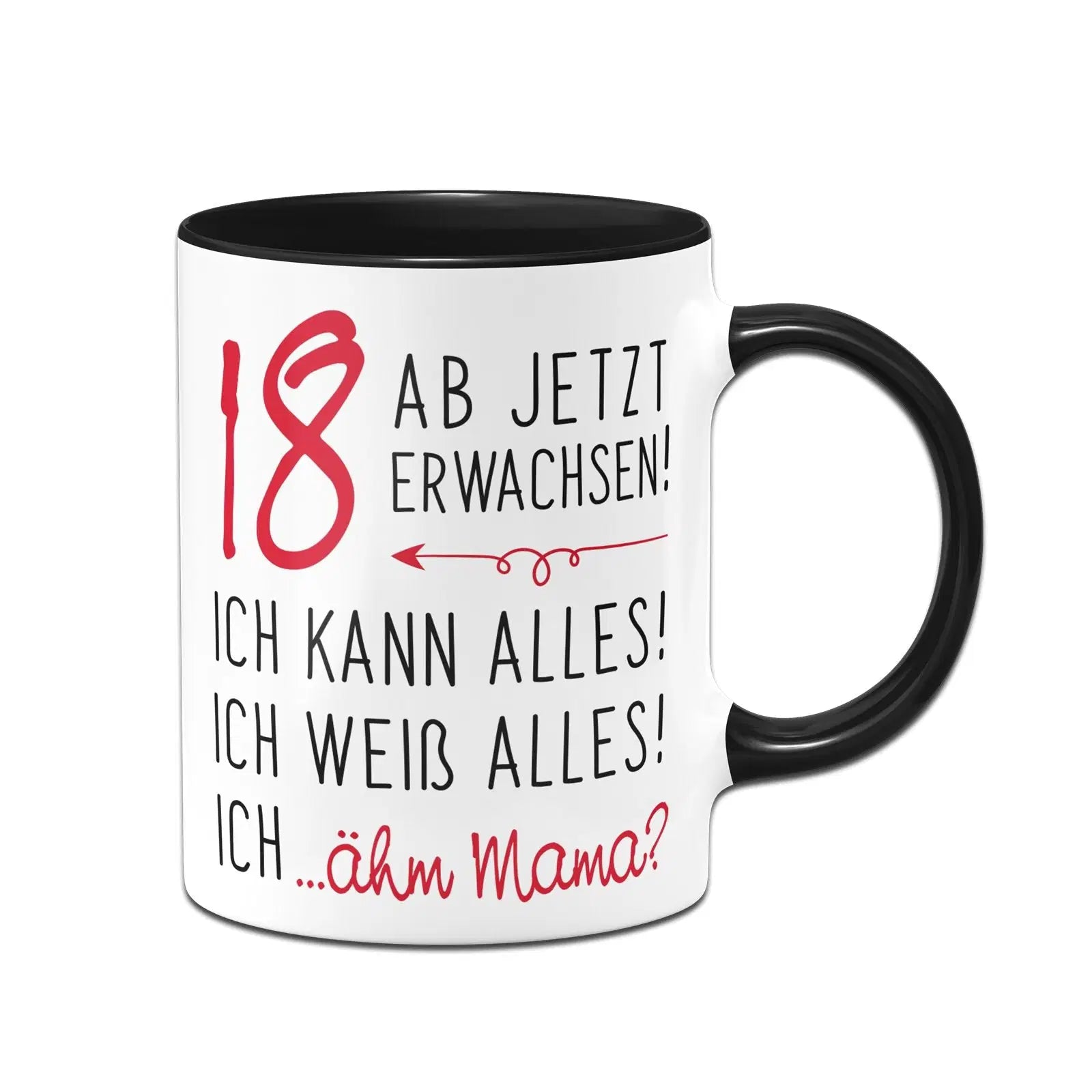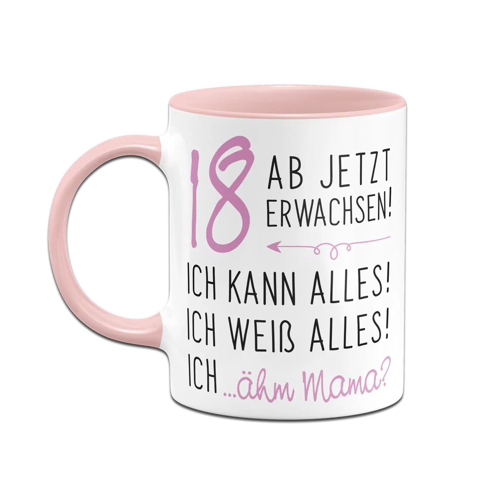 Tasse mit Spruch: 18 ab jetzt erwachsen! Ich kann alles! Ich weiß alles! Ich ...ähm Mama?