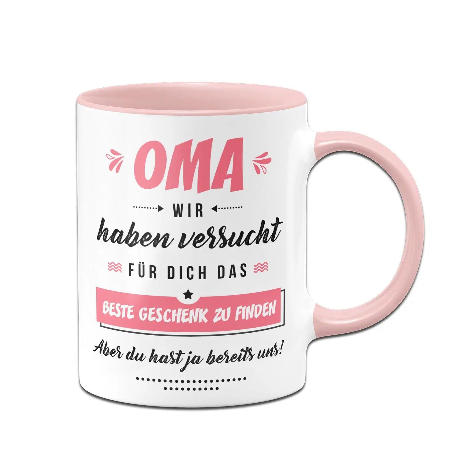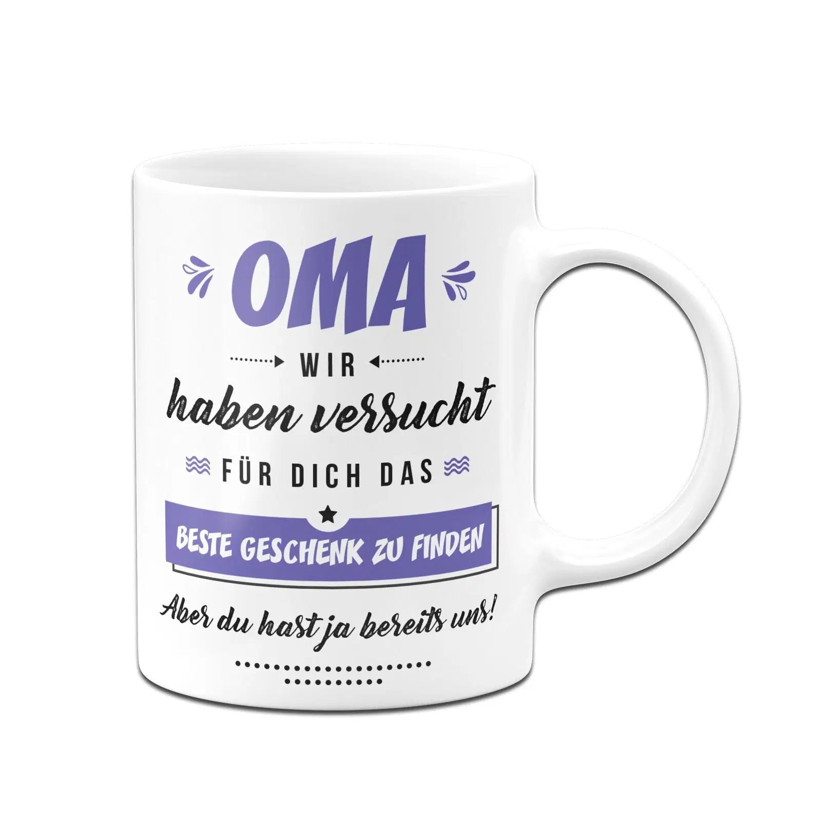 Tasse mit Spruch: Oma wir haben versucht für Dich das beste Geschenk zu finden. Aber Du hast ja bereits uns! ⭐
