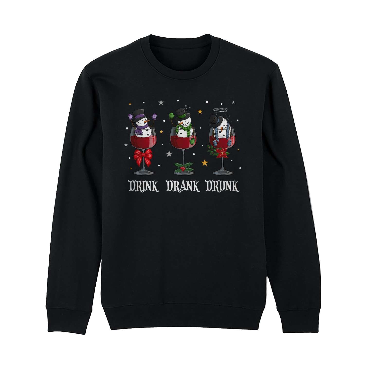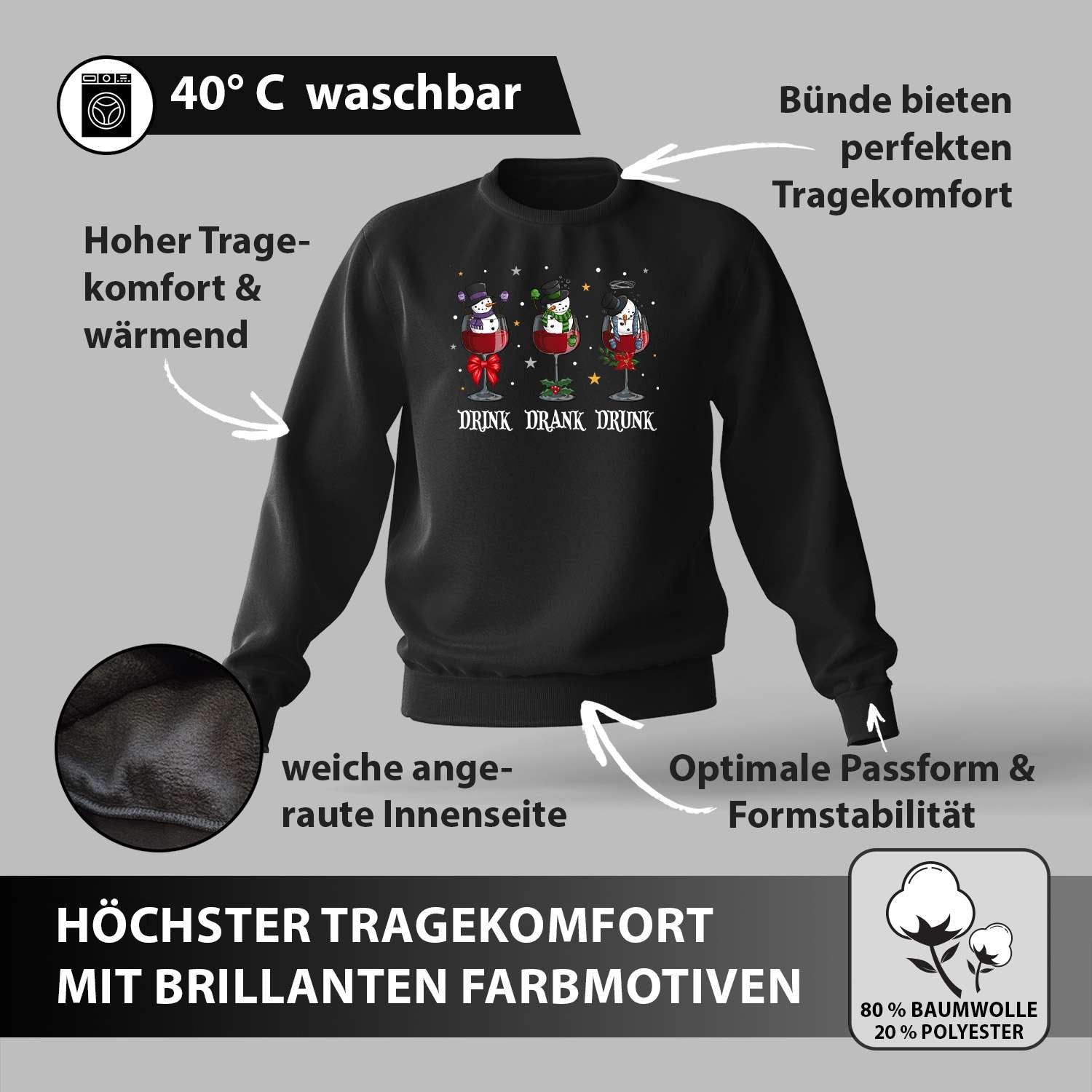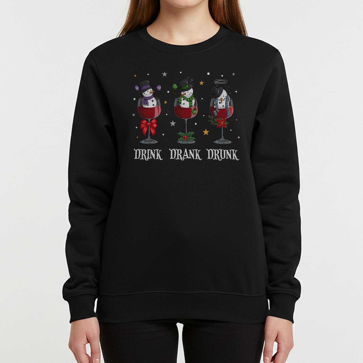 Dieser witzige Sweater zeigt drei Weingläser, die den Spruch „Drink Drank Drunk“ humorvoll zum Leben erwecken – begleitet von einem festlichen Weihnachtslook, der sofort ins Auge fällt. Ein originelles Motiv, das für Schmunzler sorgt und jede Weinrunde noch fröhlicher macht.